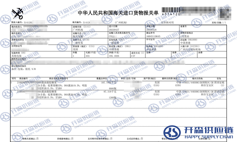 開森進口供應(yīng)鏈擁有豐富的DHA藻油進口報關(guān)操作經(jīng)驗及案例,十余年操作經(jīng)驗及案例可供參考,可按需定制DHA藻油進口方案,幫助客戶解決進口難題,快速進口清關(guān)到港到貨。